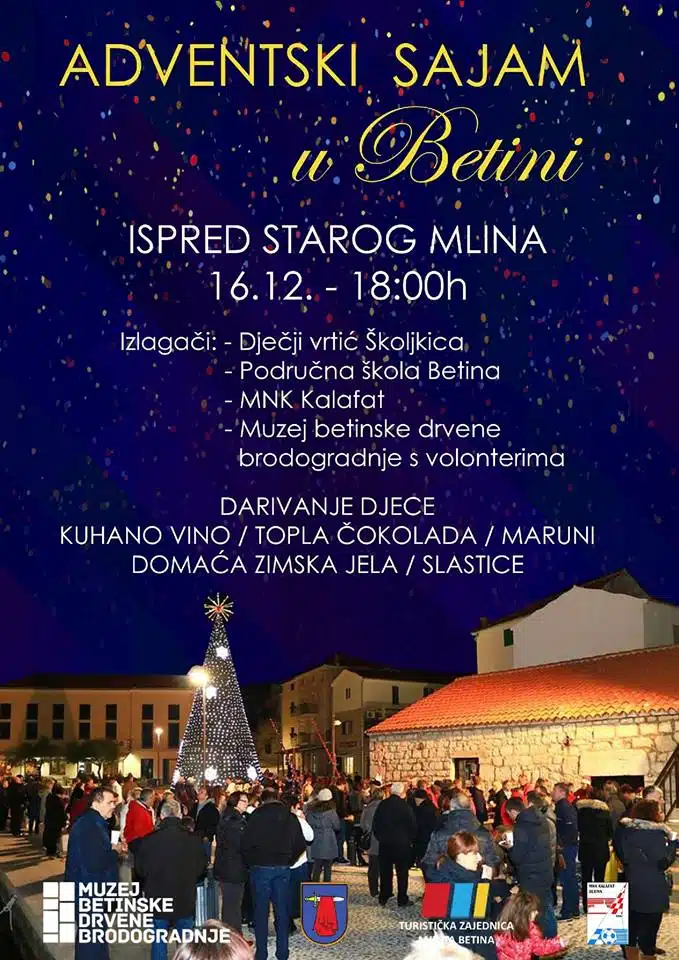 – Posjetite nas na Adventskom sajmu koji će se održati u subotu, 16. prosinca ispred Starog mlina u Betini. Zabavite se, nabavite kreativne blagdanske dekoracije i slastice na našim štandovima. Djecu očekuje još jedno darivanje, a sve ostale posjetitelje ugodna večer uz glazbu i prijatelje! Radujemo se druženju! – poručuju iz Muzeja betinske drvene brodogradnje.