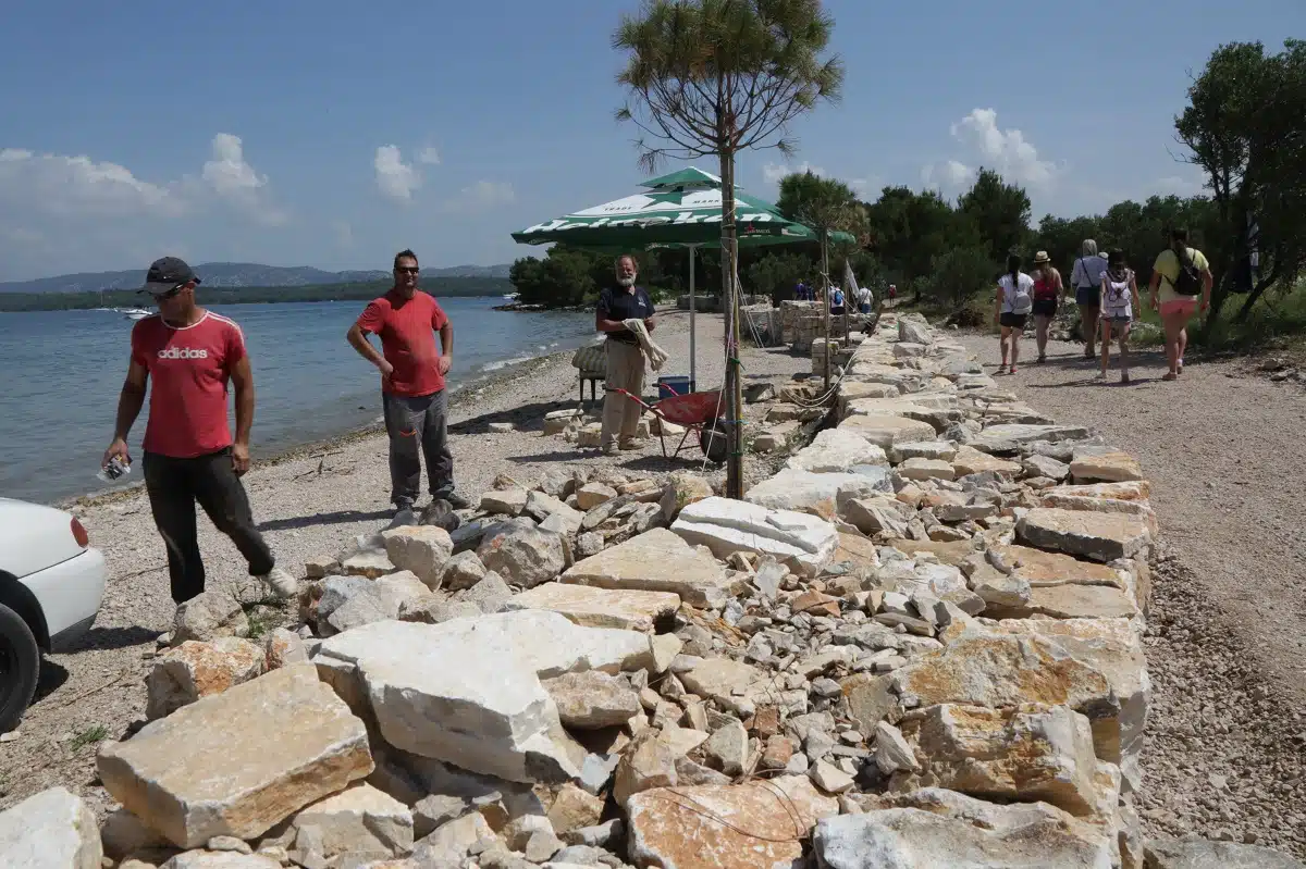 – Projekt prve arheološke plaže prijavljen je na Interreg, ali dok čekamo europska sredstva krenuli smo u izradu suhozida koji dio je projekta arhitekta Dinka Peračića. Imat će šest pinjola koje će raditi hlad, te klupe od mahagonija, drva koje se najbolje ponaša sol i more. Suhozid ide svojom starom trasom, gdje je vjekovima čuvao maslinike i vinograde od utjecaja mora, a staza je s unutarnje strane. Osim arhitektu i našim majstorima suhozida, ovdje imamo zahvaliti vlasnicima zemljišta koji nam omogućili uslužni prolaz. Općina se za uzvrat obvezala uređivati njihove maslinike – kaže načelnik Općine Murter-Kornati Toni Turčinov.