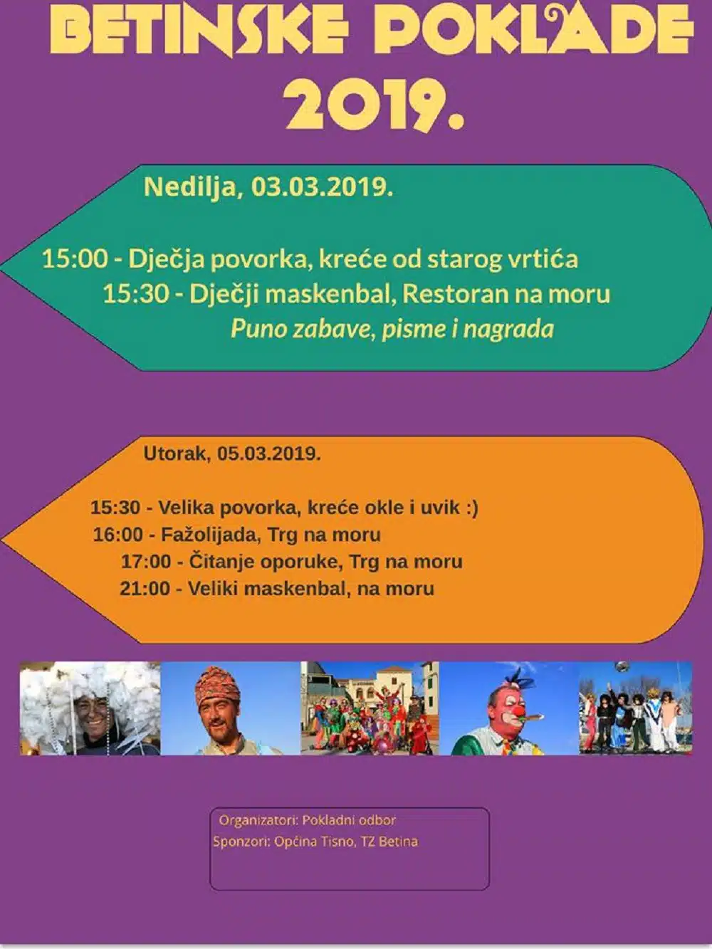 Betinske poklade 2019. za nedjelju najavljuju Dječju povorku, koja u 15 sati kreće od starog vrtića. Današnje dječje maškare samo su uvod, zagrijavanje pred veliki spektakl. On se i u Betini odvija na pokladni utorak. Betinjani se kroz organizaciju pokladnih svečanosti ne nadmeću s nikim, niti se bilo kome nameću. Zato su na plakatu napisali da velika povorka u utorak u 15.30 sati “kreće okle i uvik”.