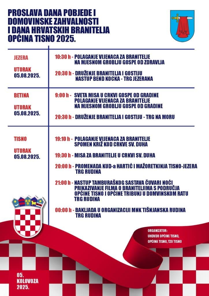Službena proslava 5. kolovoza, Dana pobjede i domovinske zahvalnosti te Dana hrvatskih branitelja na području Općine Murter-Kornati i Općine Tisno započinje u devet sati misom za domovinu u crkvi Gospe od Gradine.