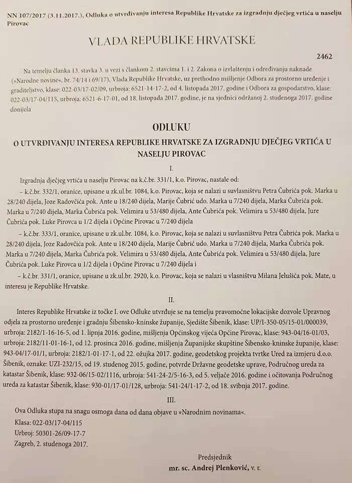 Odluku o utvrđivanju interesa Republike Hrvatske za izgradnju dječjeg vrtića u Pirovcu, Vlada Republike Hrvatske donijela je proteklog četvrtka na sjednici. Načelnik Općine Pirovac Ivan Gulam ne krije zadovoljstvo.