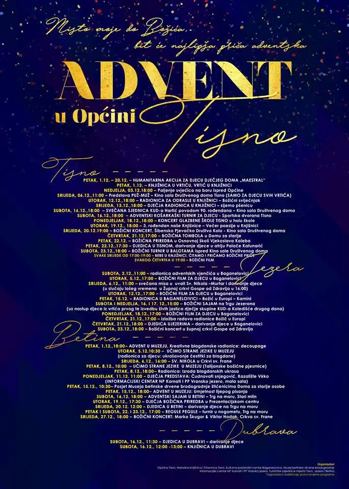 Naime, Općina Tisno u suradnji s ovdašnjom Narodnom knjižnicom i čitaonicom, Muzejom betinske drvene brodogradnje, tri turističke zajednice, župnim uredima i kulturno-umjetničkim društvima te udrugama s područja kulture i sporta pripremila je do sada najbogatiji program Adventa za područje cijele Općine.
