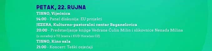 U Tisnom je danas drugi dan petodnevnog programa događanja u sklopu projekta Europa povezuje građane. Petak je rezerviran za Panel diskusiju u prostorijama Općine Tisno s početkom u 14 sati, dok se u večernjim satima očekuje dobra zabava u Kino sali Tisno. Za dobar ‘štimung’ zaduženi su Teški osjećaji, a početak glazbene večeri je u 21 sat.