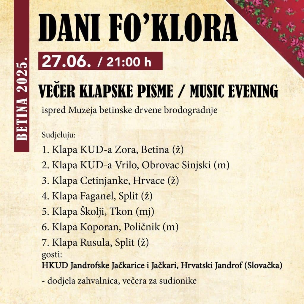 UNESCO-a zaštita bila je nužna jer se posljednjih desetljeća pod klapsko pjevanje uspješno prodaje novi, umjetno fabricirani vokalno-instrumentalni žanr koji podilazi širokom ukusu turističkih fešta i drugih masovnih okupljanja. Kako zvuči prava dalmatinska pisma večeras od 21 sat ispred Muzeja betinske drvene brodogradnje pokazat će nam ženska Klapa KUD “Zora” iz Betine, muška Klapa KUD “Vrilo” iz Obrovca Sinjskog, ženska klapa “Cetinke” iz Hrvaca, ženska klapa “Faganel” iz Splita, mješovita Klapa “Škoji” iz Tkona, muška klapa “Koporan” iz Poličnika i ženska klapa “Rusula” iz Splita.