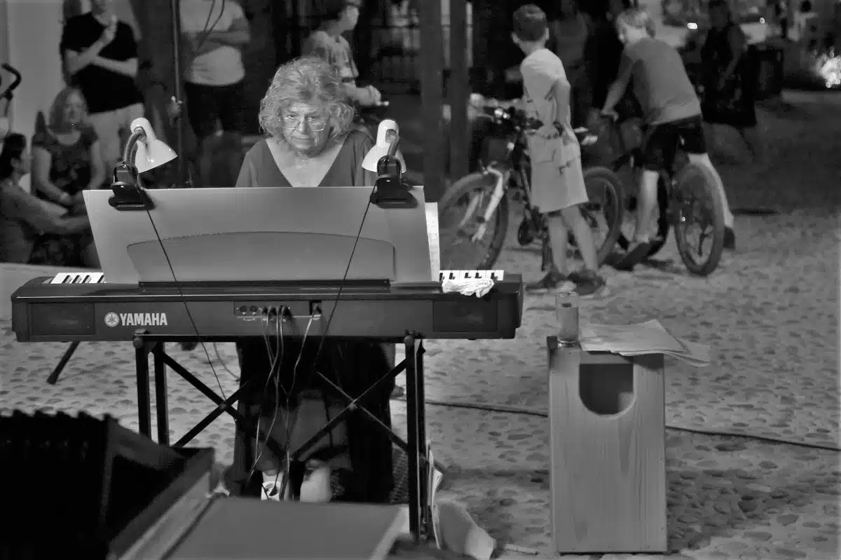 Pijanistica Ljerka Pleslić Bjelinski posebno je vezana za otok Murter, pa se njeni nastupi, kao i nastupi drugih članova ove poznate obitelji glazbenika, postali ovdje redoviti tijekom posljednjih barem 20 godina. Uobičajeno nastupa na murterskom sv. Roku, a sinoć je njen nastup izvrsno uklopljen i u intimni ambijent trga pred Muzejom betinske drvene brodogradnje.