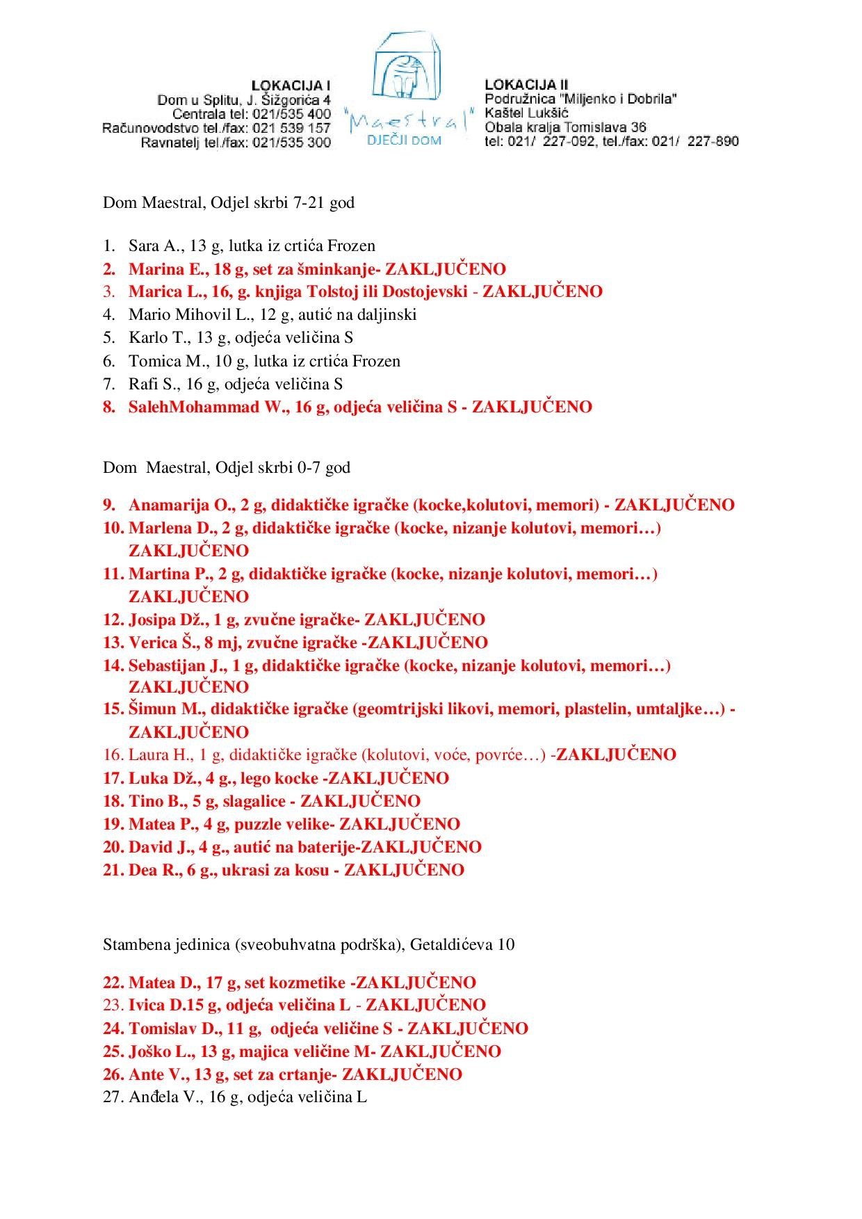 Od pedesetak djece Dječjeg doma Maestral iz Splita, koja su napisala svoje blagdanske želje, ostalo je još njih trinaest.
