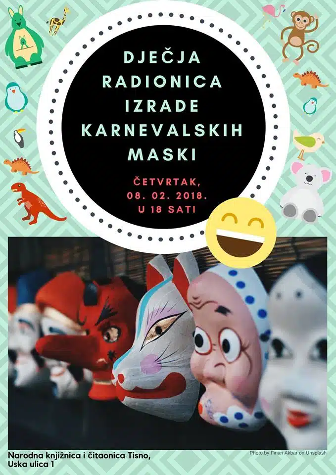 U organizaciji Narodne knjižnice i čitaonice Tisno, danas, 8. veljače s početkom u 18 sati bit će održane dječje radionice izrade i ukrašavanja karnevalskih maski i to na dvije lokacije. Spomenute radionice bit će održane u Tisnom i Jezerima, točnije u prostorijama Narodne knjižnice i čitaonice Tisno i u Kulturno pastoralnom centru Baganelovica Jezera.