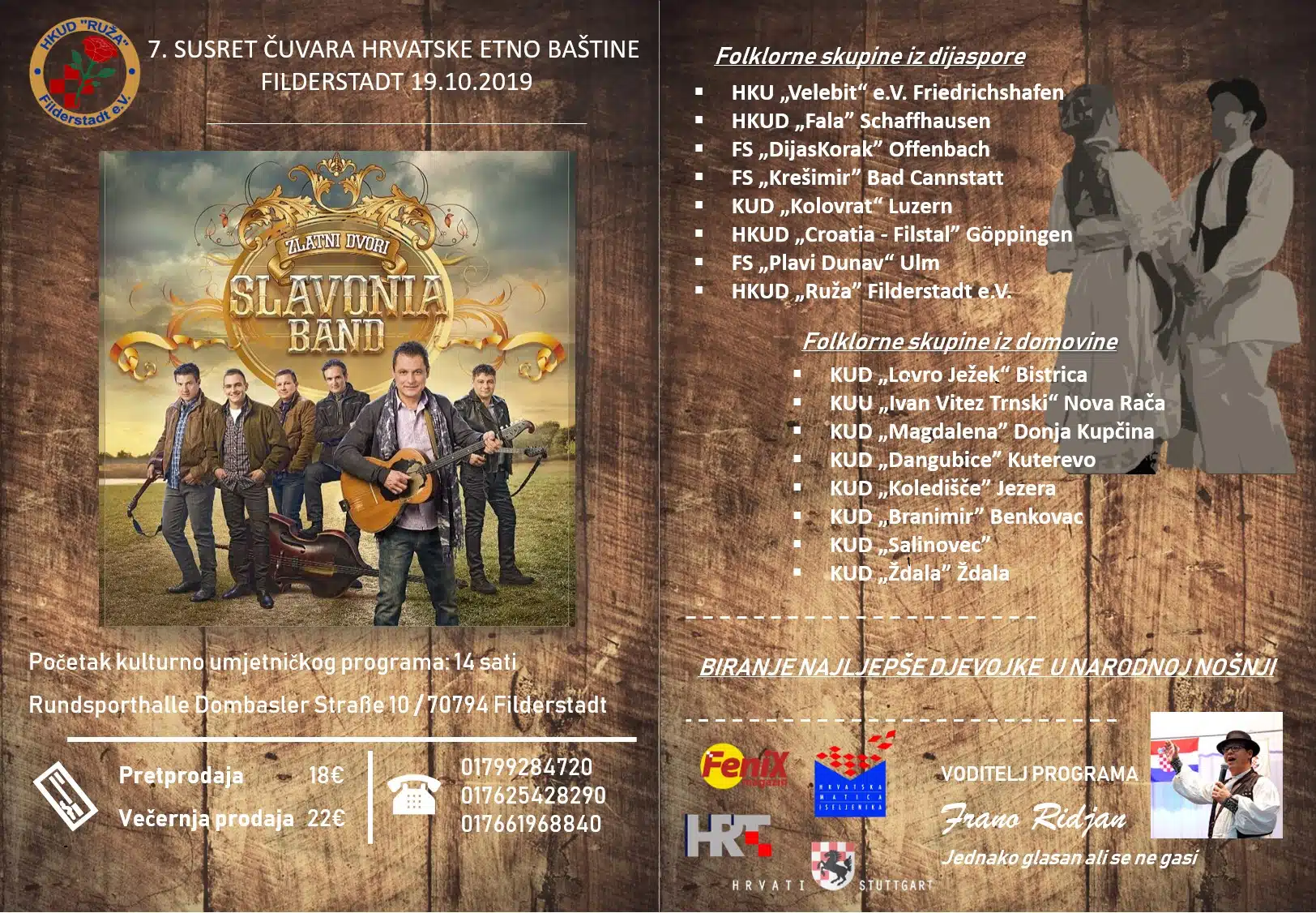 Međunarodni folklorni festival Čuvari hrvatske etno baštine održao se po 7. put 19. studenoga u Filderstadtu pod pokroviteljstvom Hrvatske matice iseljenike. Cilj manifestacije je povezivanje hrvatskih folklornih društava u iseljeništvu s društvima iz domovine kako bi se kroz očuvanje hrvatske tradicijske kulture jačao kulturni identitet Hrvata izvan RH te promovirala ljepota i bogatstvo naše folklorne baštine.
