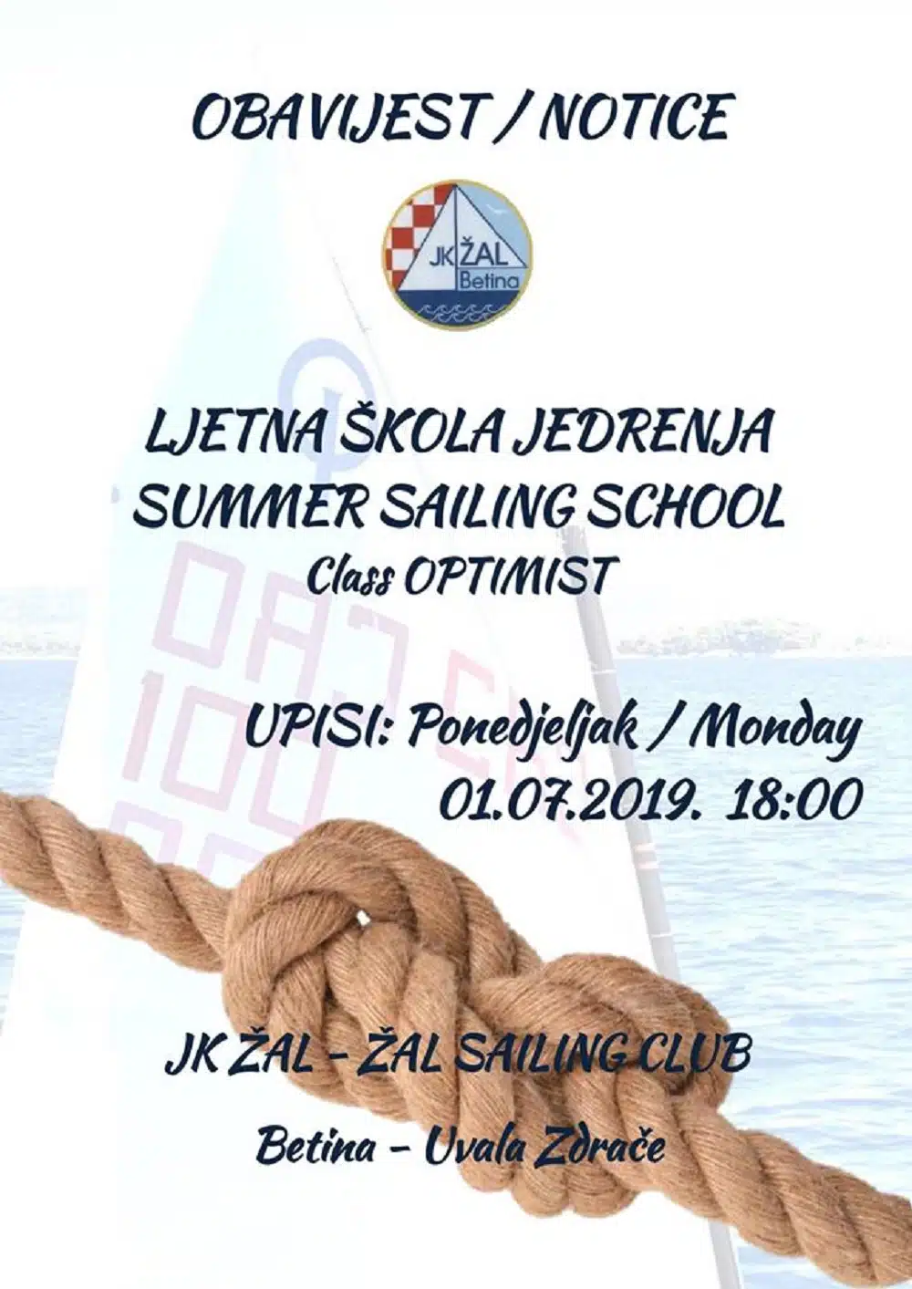 – Obavijest zainteresiranima: ljetna škola jedrenja JK Žal počinje s treninzima od slijedećeg tjedna! Upisi su u ponedjeljak 1. srpnja u prostorijama Kluba od 18 do 20:00. Vidimo se! – pozivaju “Žalovci”.