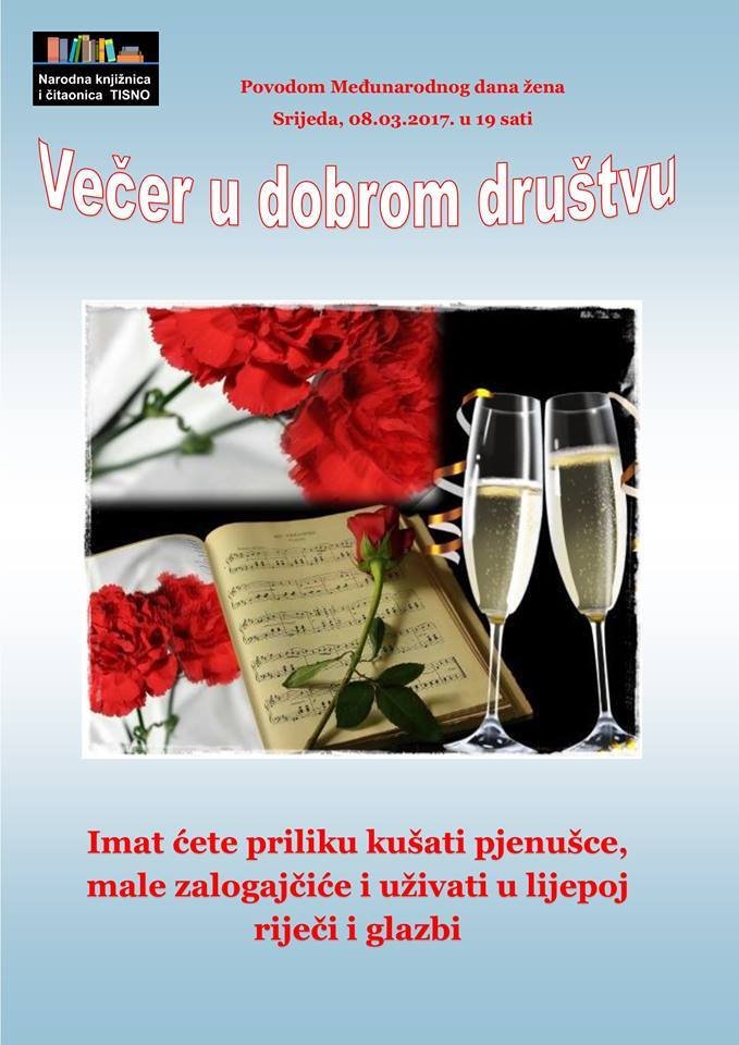 Knjižničarke tamošnje knjižnice za sve pripadnice nježnijeg spola pripremile su pjenušac, malene zalogajčiće, lijepu riječ i još bolju glazbu. “Večer u dobrom društvu” održat će se u prostorijama Narodne knjižnice i čitaonice Tisno, danas, 8. ožujka s početkom u 19 sati.