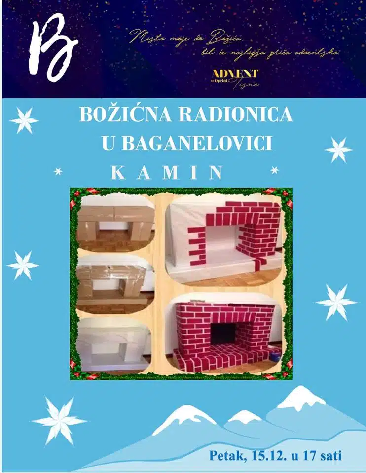 U Kulturno pastoralnom centru Baganelovica u Jezerima, u organizaciji Narodne knjižnice i čitaonice Tisno, uz asistenciju profesora Karla Klarina, ovog će petka, 15. prosinca biti održana Božićna radionica. Na današnjoj će radionici u Baganelovici sudionici izrađivati kamine. Početak je u 17 sati.