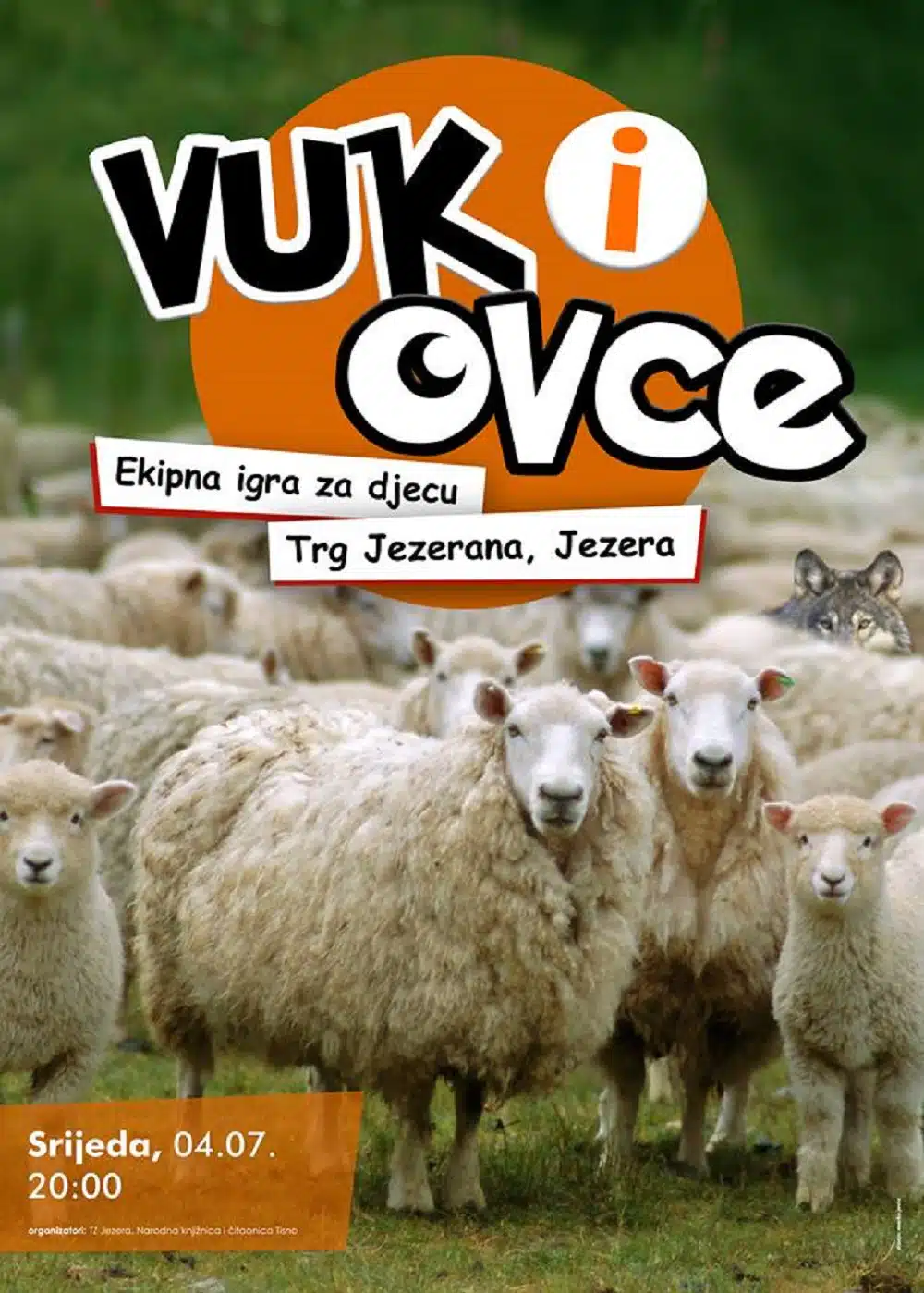 Jezera, Trg Jezerana, u 20 sati – u sklopu turističke Manifestacije “Jezerski dani mora” u centru mjesta se priređuje ekipna igra za djecu “Vuk i ovce”. – Sjećate li se ove naše stare igre? U srijedu, 4. srpnja imat ćete je priliku vidjeti uživo sa živim figurama. Početak je u 20 h, a prijave i preuzimanje majice već od 18 h – stoji u pozivu.