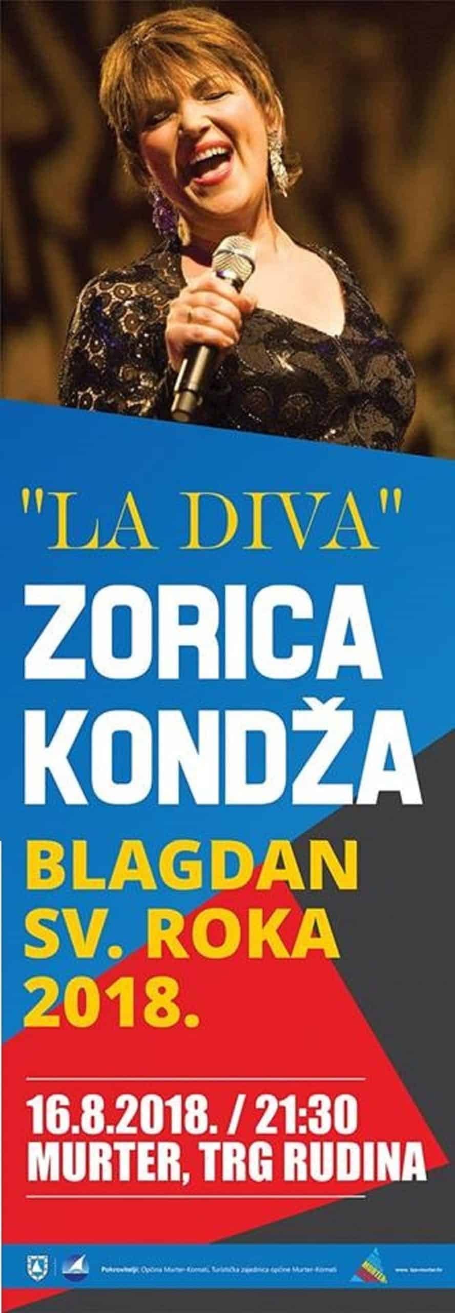 Koncert ikone hrvatske glazbene scene Zorice Kondže Murterini najavljuju kao krunu niza fantastičnih koncerata koji se ovog ljeta održavaju u njihovom mjestu. Splićanka, odrasla na rivi Gojače u Kaštel Sućurcu, od djetinjstva je svojim jedinstvenim glasom slovila kao “slavuj Bogom danog glasa”. Iako za sebe voli reći da je rokerica u duši, gđa. Kondža može s lakoćom izvesti bilo koji stil pjesme. A njene pjesme, prate nas sviju, poput Oliverovih i bezvremenske su.n Koncert će se održati u četvrtak, povodom blagdana sv.Roka,16.8., s početkom u 21:30h na Trgu Rudina.
