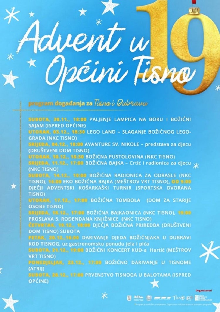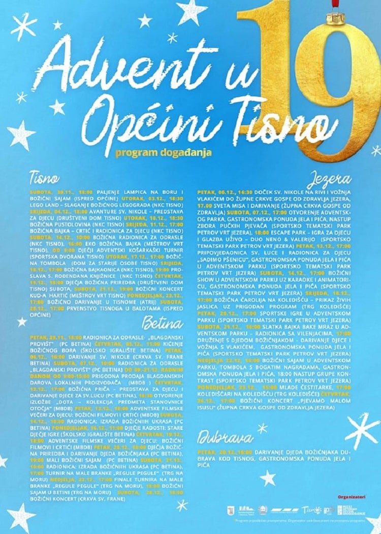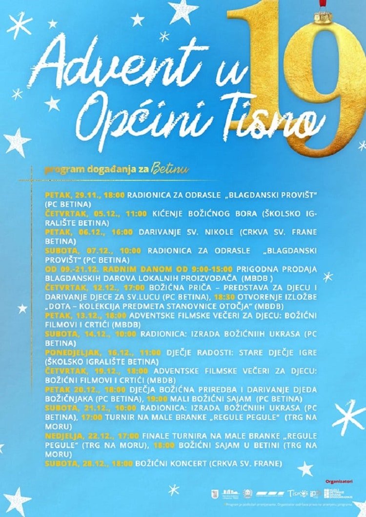 Posljednji vikend u studenom rezerviran je za početak Adventa u Općini Tisno. Bogat program u Tisnom, Jezerima, Betini i Dubravi namijenjen je svim uzrastima, a osmišljen je u suradnji s Narodnom knjižnicom i čitaonicom Tisno, turističkim zajednicama sva tri otočna mjesta, Prezentacijskim i informacijskim centrom Betina te Muzejom betinske drvene brodogradnje osmišljen. U subotu 30. studenog božićnim sajamom i paljenjem lampica na boru ispred zgrade Općine svečano se otvara ovogodišnji Advent, no on počinje već večeras blagdanskom radionicom u Betini.