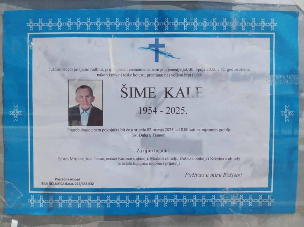 Zadnjeg dana lipnja napustio nas je još jedan od onih Tišnjana koji su postali legende još za života – u 72. godini života otišao je Šime Kale. Posljednji ispraćaj bit će upriličen danas, u srijedu, 2. srpnja 2025. godine u 18 sati na mjesnom groblju Sv. Duha u Tisnom.