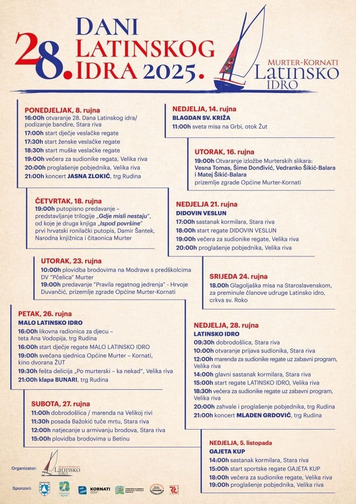 Subota, 27. rujna, bit će posvećena druženju i armivanju brodova, a dan kasnije, 28. rujna, održat će se središnji događaj – velika regata Latinsko idro. Program počinje jutarnjim okupljanjem i prijavama sudionika, slijede tradicionalne regate i susreti kormilara, a navečer će se održati proglašenje pobjednika i koncert Mladena Grdovića na trgu Rudina.