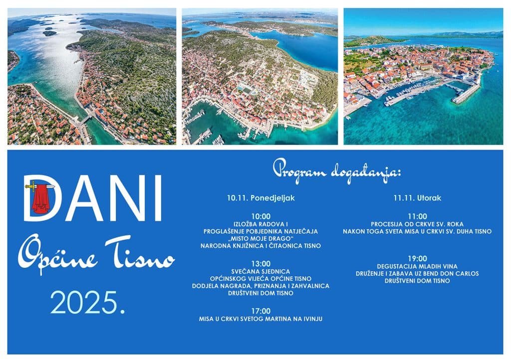 Tisno slavi Dan Općine i blagdan svog nebeskog zaštitnika sv. Martina. Pod naslovom “Dani Općine Tisno” za ponedjeljak i utorak najavljen je program čiji je središnji događaj svečana sjednica Općinskog vijeća na kojoj će biti uručene nagrade, priznanja i zahvalnice zaslužnim institucijama i pojedincima.