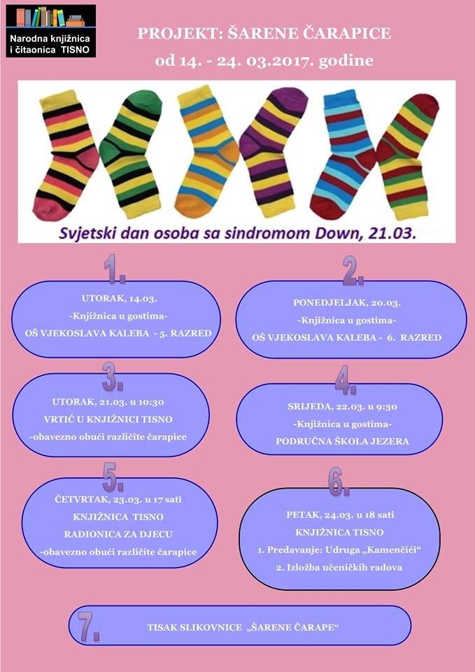 U nastavku donosimo plakat na kojem je detaljno prikazan plan i program projekta „Šarene čarapice“ Narodne knjižnice i čitaonice Tisno: