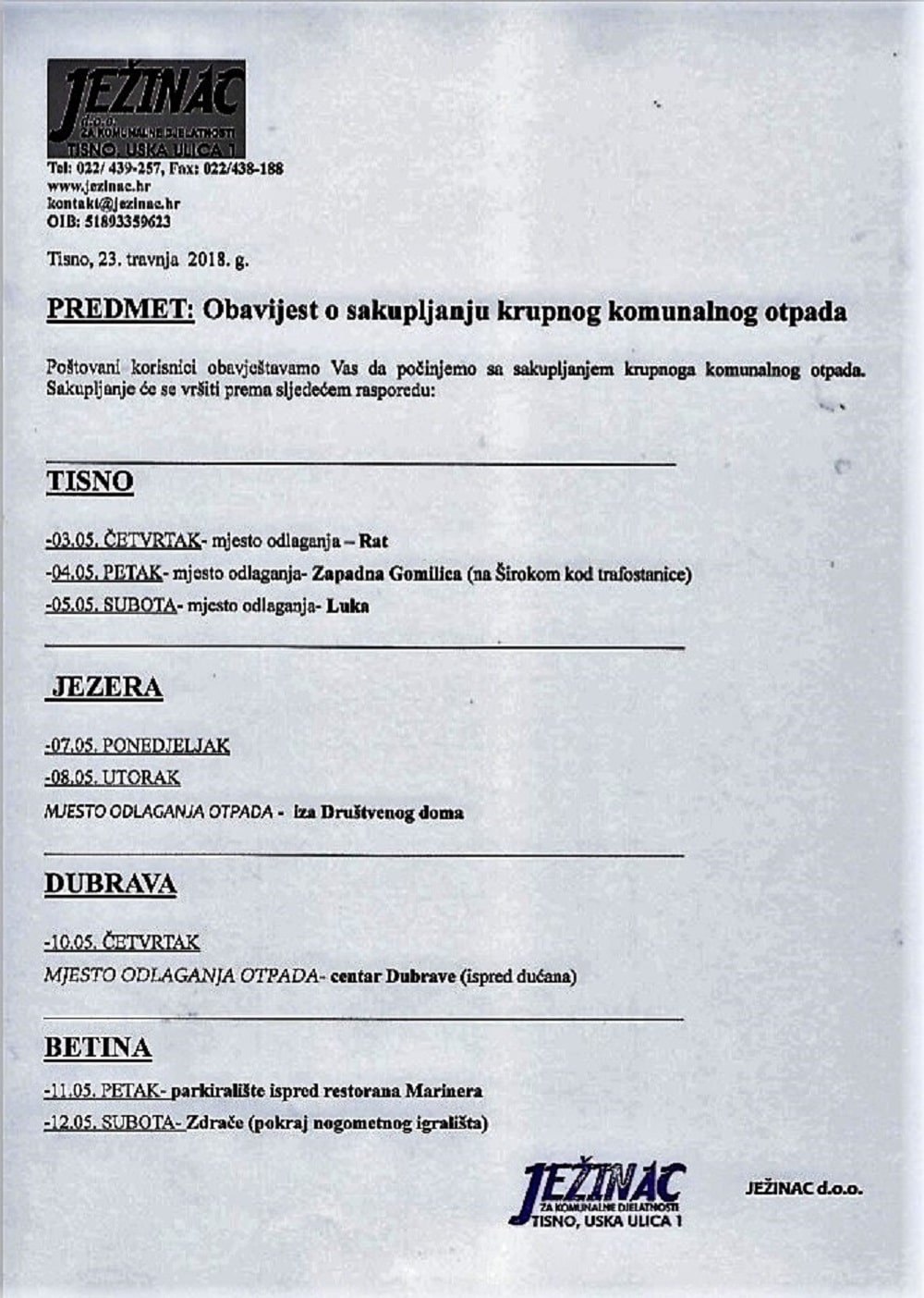 – Neki dan je ostavljena Obavijest o sakupljanju krupnog komunalnog otpada u Tisnom (POVEZNICA), u kojoj je uz naznačene datume i lokacije najavljeno i da će biti će postavljeni odvojeni spremnici za zeleni rezani otpad, PVC ambalažu te elektronički otpad. Ljudi su ujedno i zamoljeni da prilikom odlaganja odvoje otpad, ali običaji ljudi se teško mijenjaju. Komunalni redarstvo Općine Tisno ne može u svakom trenu biti na svakom mjestu i kazniti baš sve prekršaje, pa nam ostaje da ustrajemo u informiranju i uzdati se će nove obrasce ponašanja prema otpadu usvojiti kao i sve novine do sada – rekla nam je Sandra Perina, direktorica Ježinca.