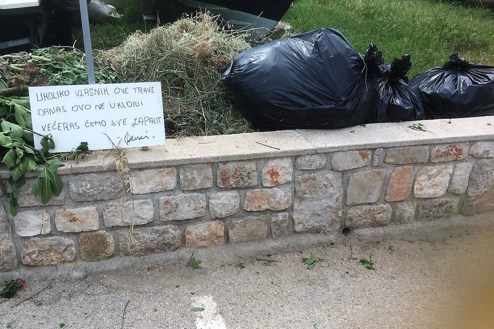 – UKOLIKO VLASNIK OVE TRAVE DANAS OVO NE UKLONI VEČERAS ĆEMO SVE ZAPALITI – napisao je ljutiti Tišnjanin na tabli ostavljenoj pored hrpe zelenog otpada, granja, lišća, trave, zemlje… iz nečije okućnice kojima su jučer zatrpani kontejneri u ulici Put Jazine.