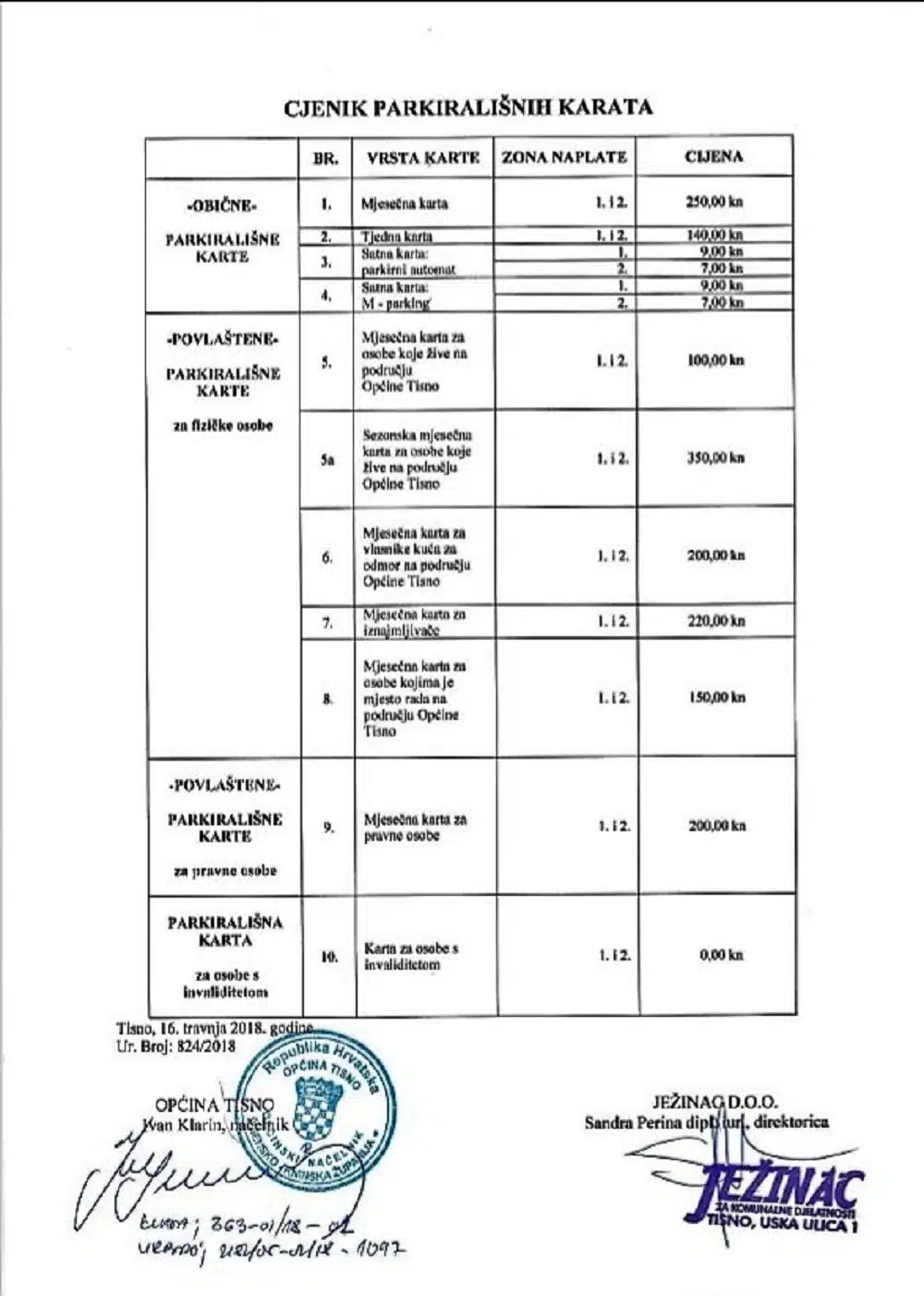 Evo cjenika parkirališnih karata po vrsti karte i zone: