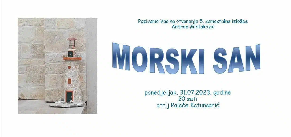 U atriju palače Katunarić večeras (ponedjeljak, 31. srpnja) u 20:00 sati bit će otvorena izložba “Morski san” svestrane likovne umjetnice i volonterke Narodne knjižnice i čitaonice Tisno Andree Mintaković.