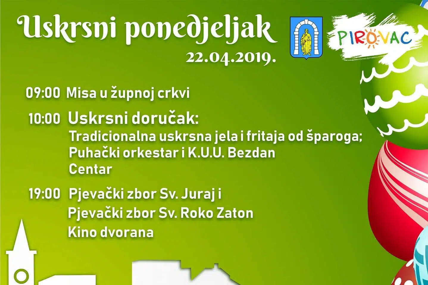 TZ Općine Pirovac poziva na uskršnji doručak koji od 10.00 sati u centru pripremaju Konoba Nono i Restoran i pizzeria Spalladium Pirovac, zajedno s pekarnama Laura i Pirovac. Nastupaju KUU Bezdan i Puhački orkestar Pirovac. Navečer u 19.00 sati u kino dvorani koncert će održati domaći Pjevački zbor sv. Juraj i Pjevački zbor sv. Roko iz Zatona.