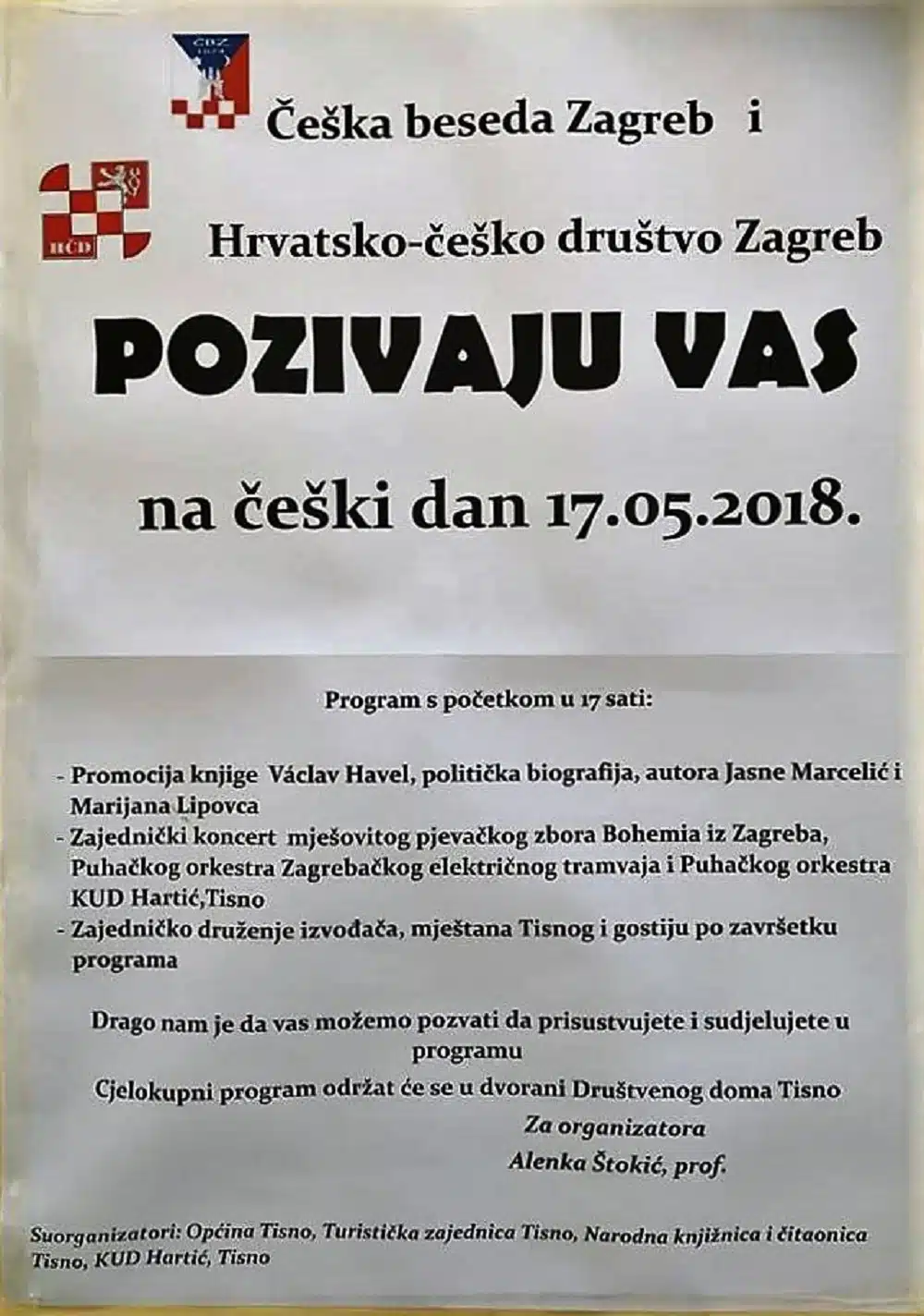Predstavljanje knjige će se održati u Društvenom domu u Tisnom s početkom u 17 sati, a program Češkog dana potom se nastavlja zajedničkim koncertom Mješovitog pjevačkog zbora Bohemia iz Zagreba, Puhačkog orkestra Zagrebačkog električnog tramvaja i Puhačkog orkestra KUD-a Hartić.