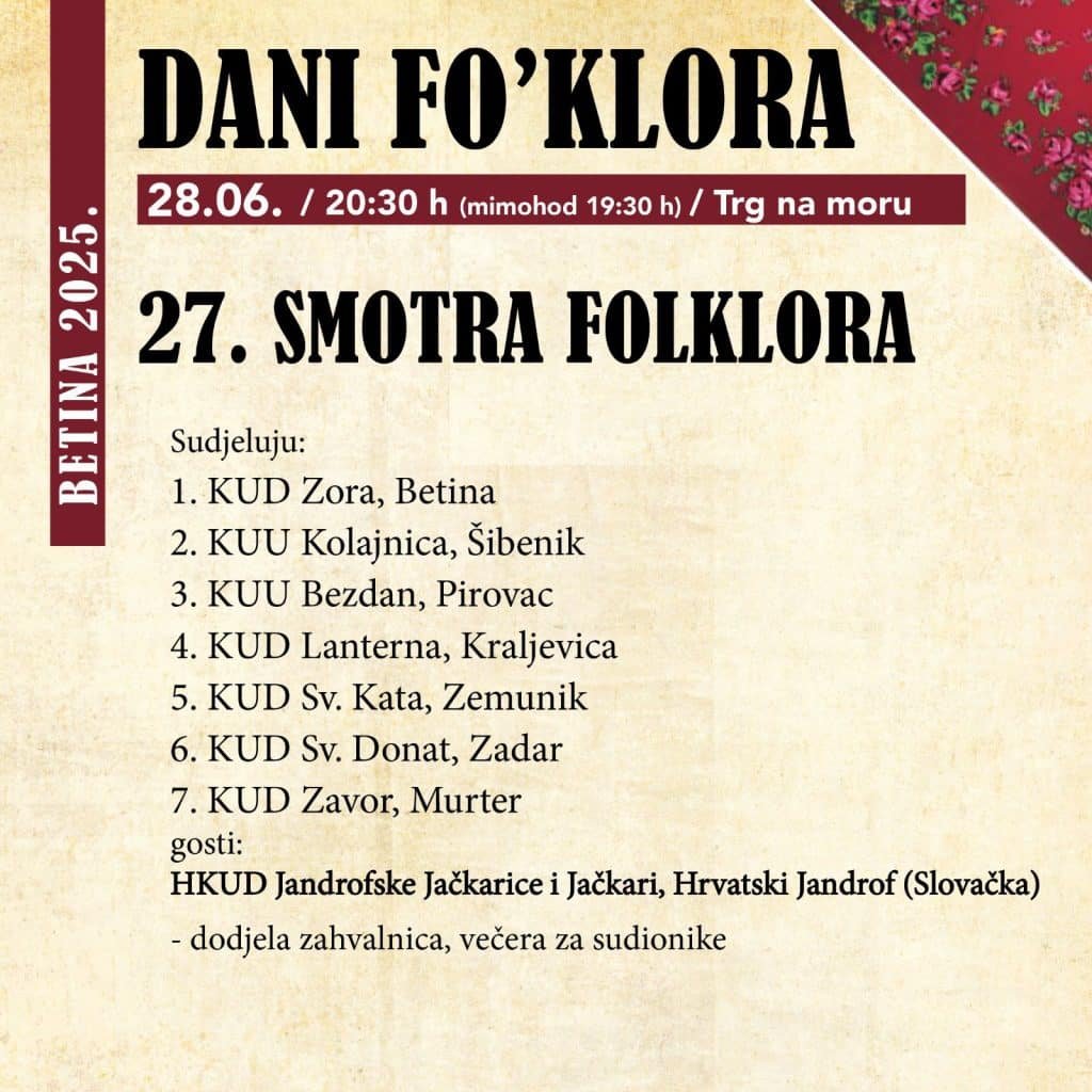 “Dani fo’klora” ulaze u veliko finale – večeras se na pozornici betinskog Trga na moru održava Smotra folklora na kojoj će nastupiti sedam folklornih ansambala iz Šibensko-kninske, Zadarske i Primorsko-goranske županije te jedan iz inozemstva.