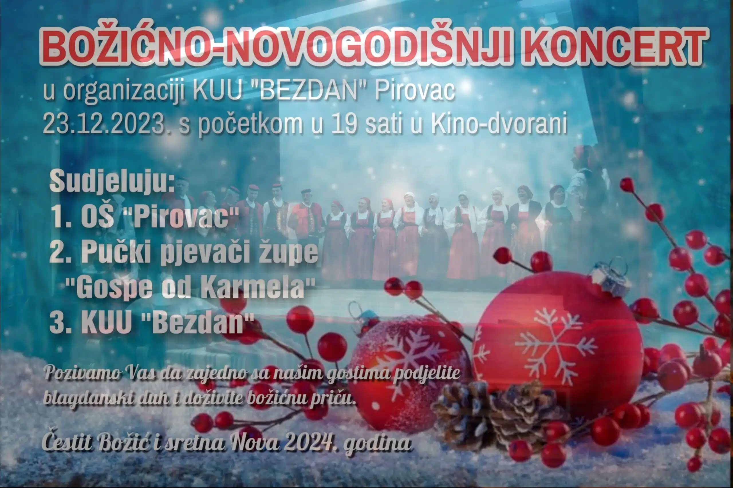 U organizaciji Kulurno-umjetničke udruge “Bezdan” u pirovačkoj kino dvorani večeras s početkom u 19 sati odvija se božićno novogodišnji koncert na kojem, uz pirovačku folklornu skupinu, nastupaju Osnovna škola “Pirovac” i Pučki pjevači župe Gospe od Karmela.