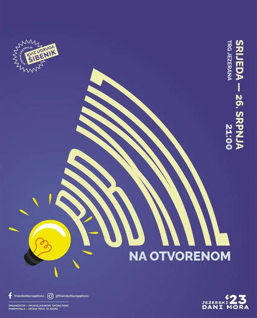 “Utorkom su na travnjaku ispred šibenskog Azimuta, a ovu srijedu na Trgu Jezerana. Kakva nam je pitanja ove godine priredila ekipa iz Kviz udruge Šibenik možete saznati od 21.00 sat, a prijaviti se možete na stolu za prijave do početka kviza – stoji u pozivu domaćina, u Jezerima vrlo aktivne Udruge “Prijatelji Europe Općine Tisno”.