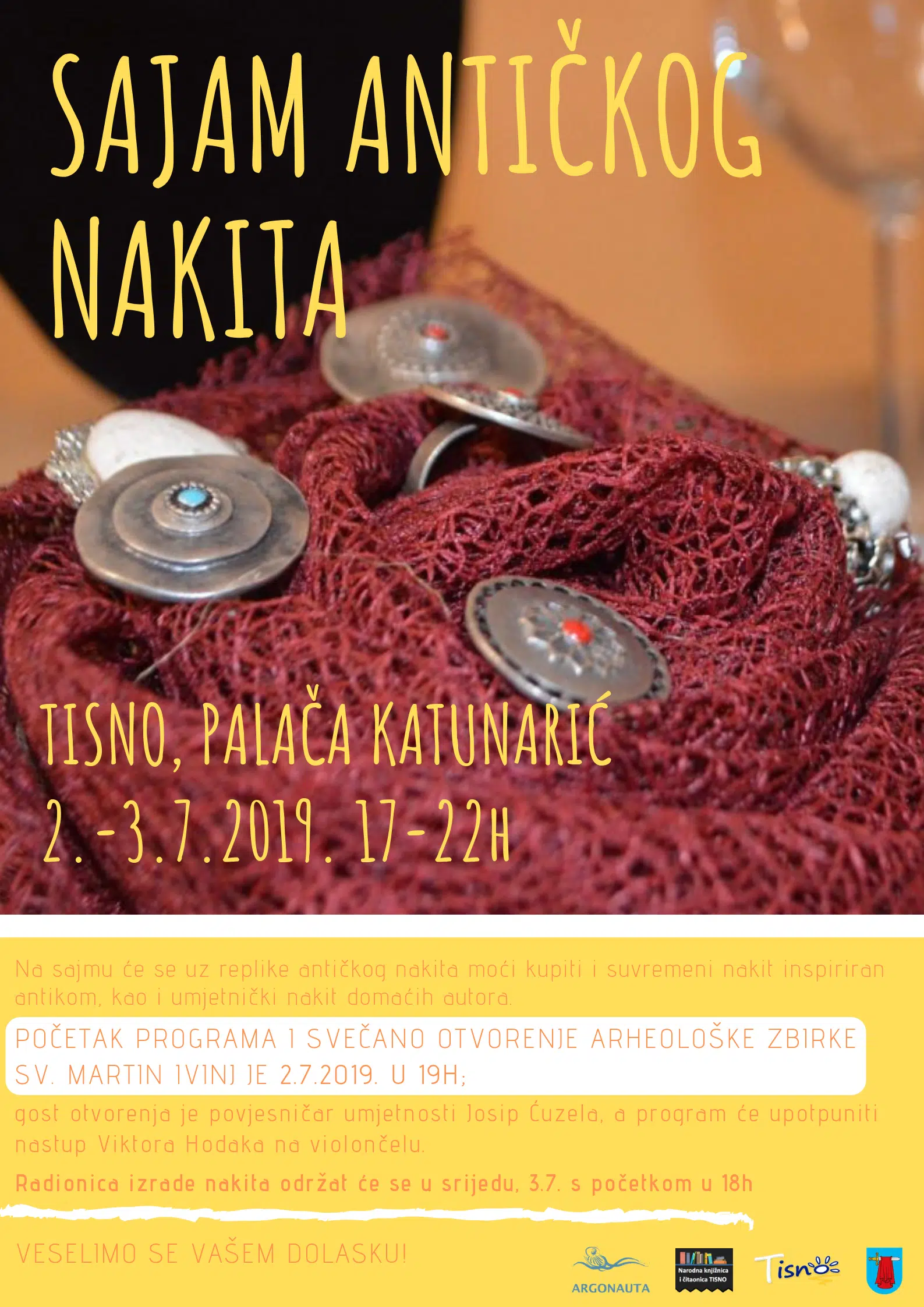 Udruga Argonauta u suradnji s TZ-om te Narodnom knjižnicom i čitaonicom, a uz financijsku pomoć Općine Tisno u atriju palače Katunarić u Tisnom 2. i 3. srpnja organizira drugi “Sajam antičkog nakita” .